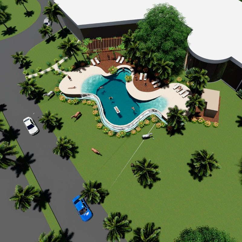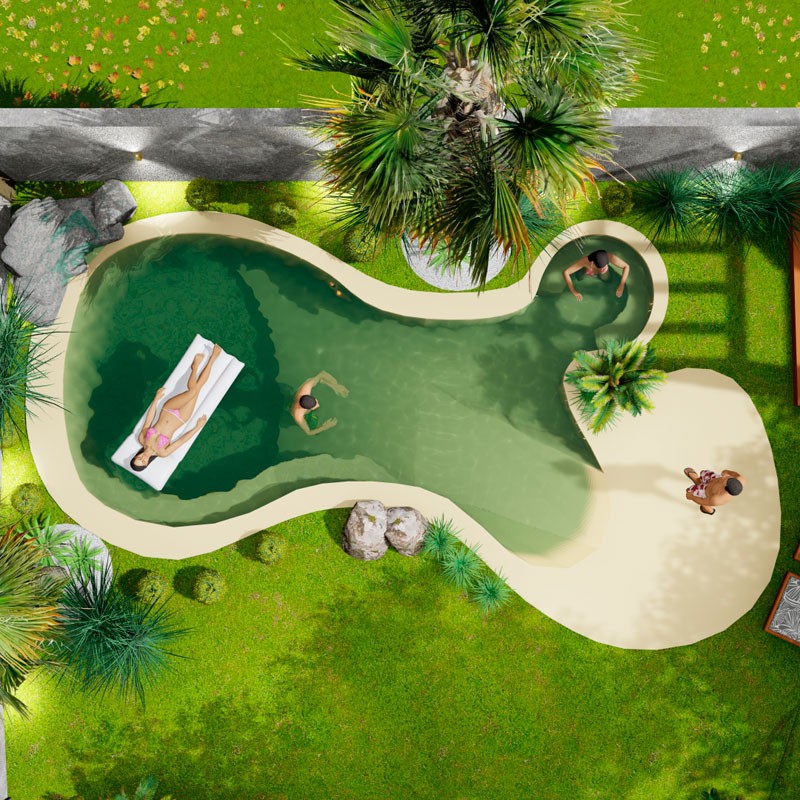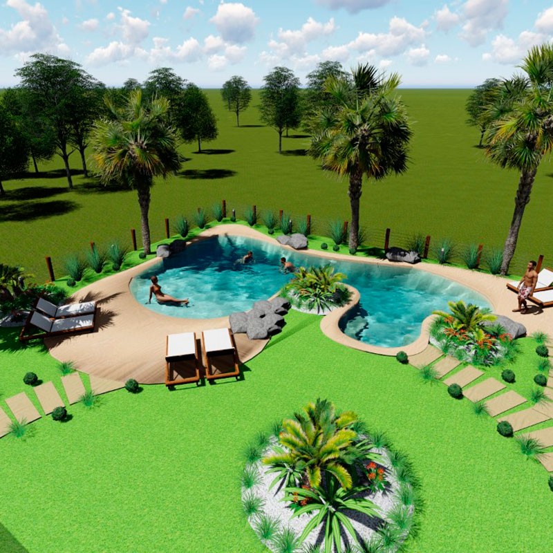 Realizamos la construcción de toda la piscina, desde el diseño, excavación, hormigonado, instalación de bomba y filtro, impermeabilización y revestimiento con arena, hasta el paisajismo con rocas y plantas de su elección.