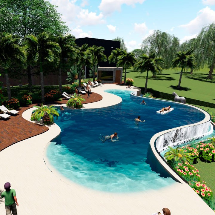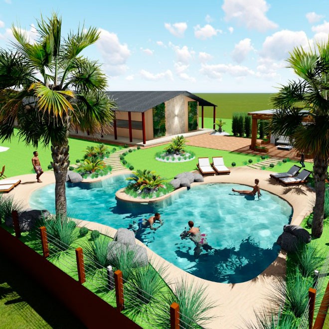 De acuerdo a las posibilidades del terreno, trabajamos con el desarrollo de proyectos para lograr el mejor uso de su espacio de lazer, se puede tener una gran o pequeña piscina, de acuerdo con su espacio, con cascada, piedras a los lados, banco de hidromasaje, borde infinita, islas, bar húmedo ... Todo esto integrado con la naturaleza.
